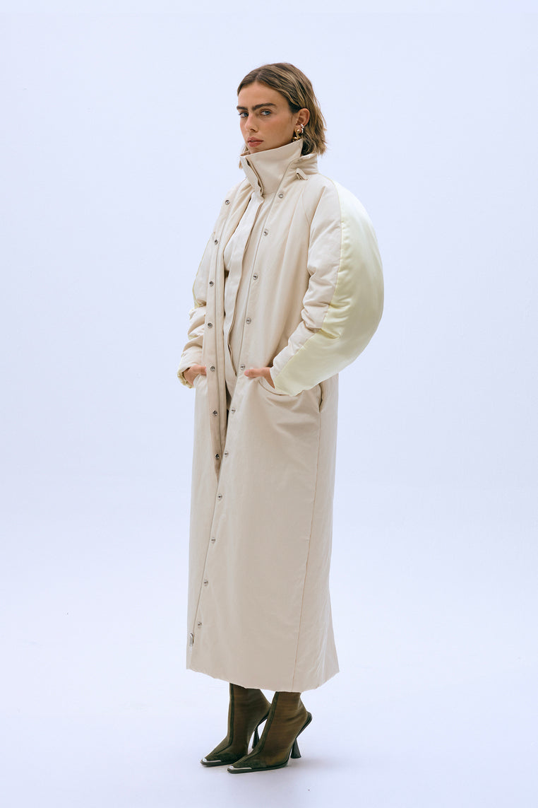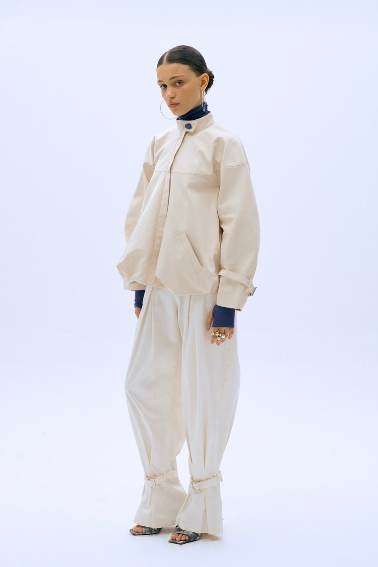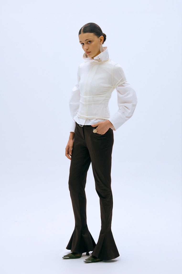 Brote es una colección que se adentra en el universo invisible de la salud mental, ese lugar donde todo sigue funcionando hacia fuera mientras algo se rompe, se bloquea o se transforma por dentro. Las prendas traducen este estado emocional a través de estructuras que aprietan o contienen, capas que protegen o agobian y cortes que dividen, convirtiéndose en metáforas físicas de aquello que rara vez se deja ver.