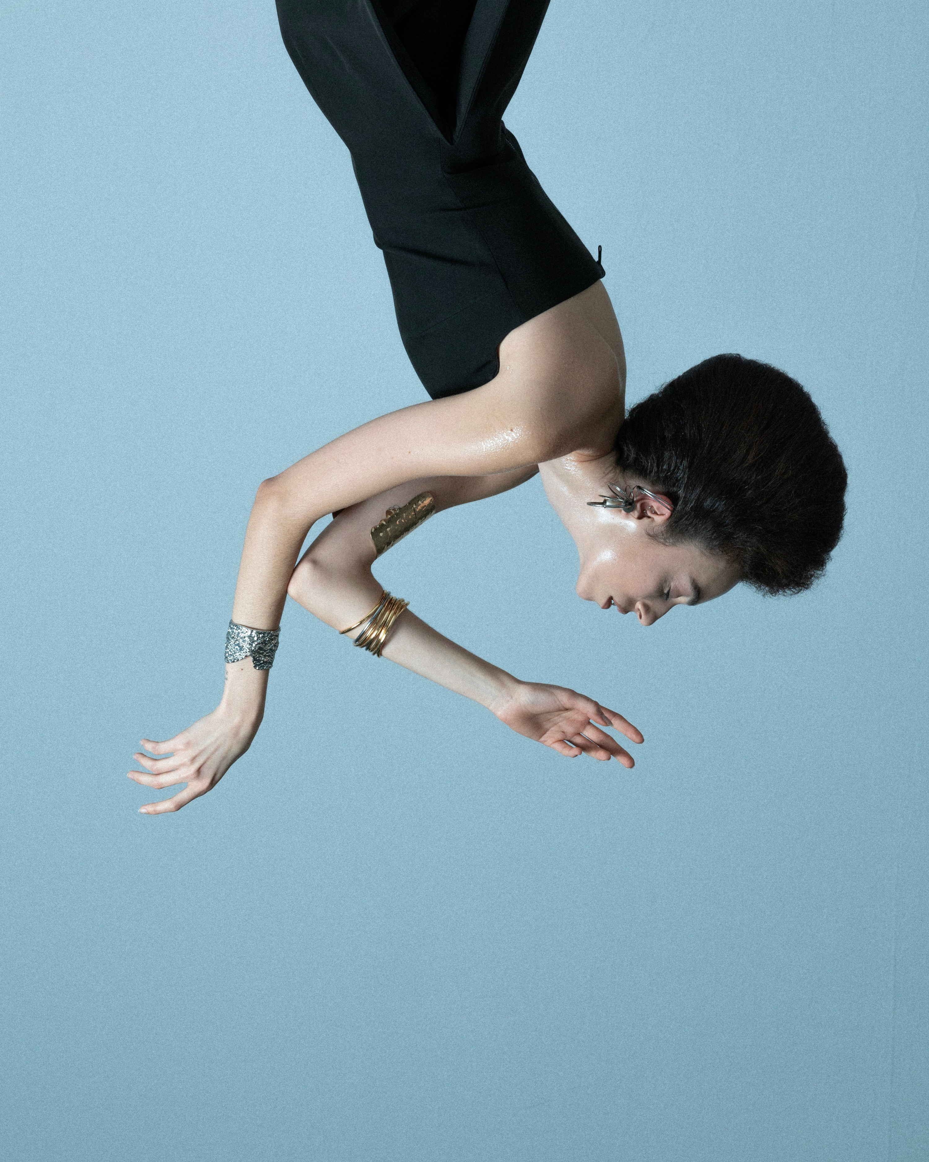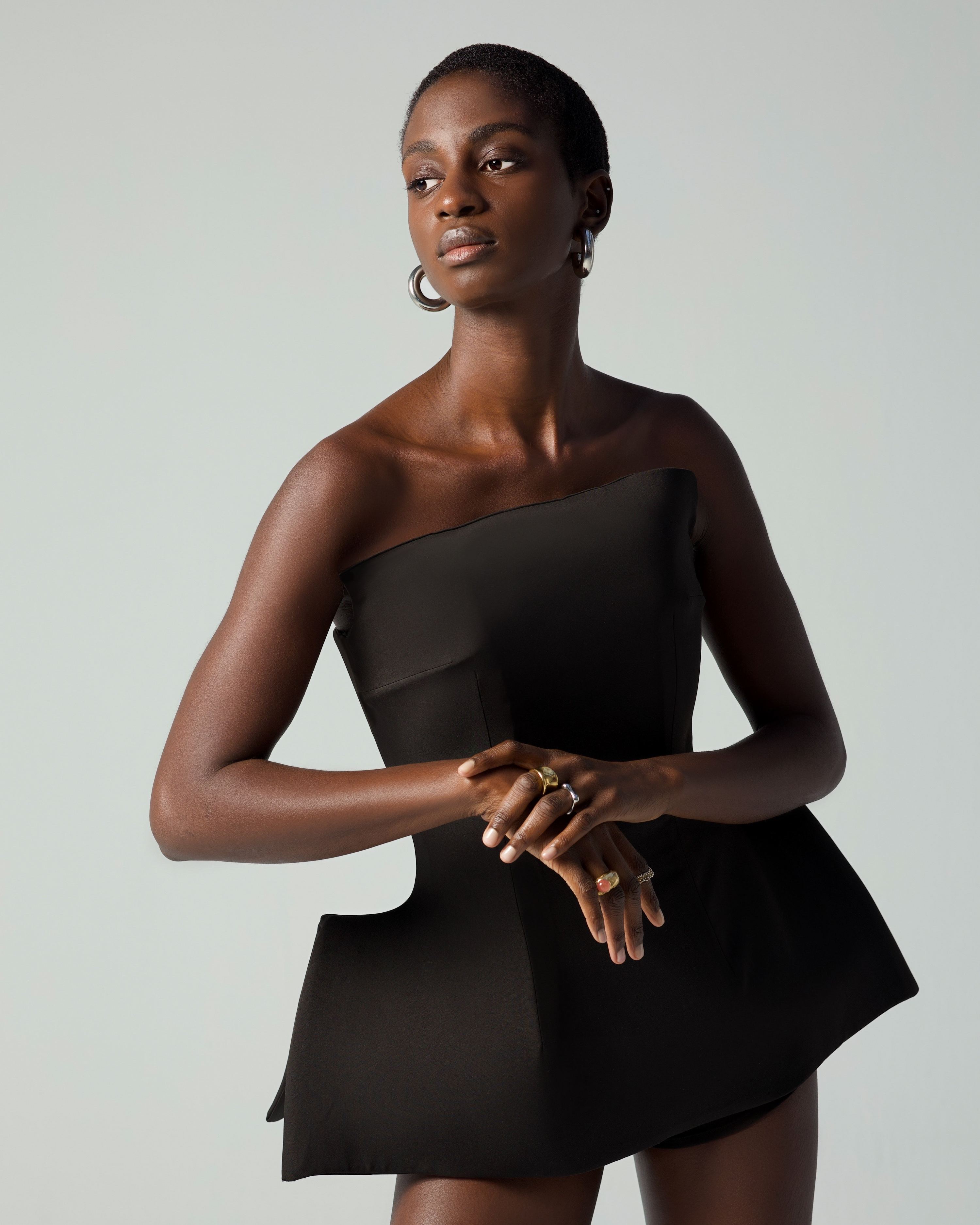 Mentario se construye en una única voz: el negro. Un crepe ligero y elástico envuelve cada pieza, otorgando fluidez y estructura en perfecta contradicción. Las siluetas juegan con el equilibrio: cinturas ceñidas que contrastan con volúmenes arquitectónicos en caderas y hombros, dejando detalles al descubierto en espalda, abdomen y clavículas. Cada diseño es un ejercicio de precisión y movimiento, donde el negro se convierte en lenguaje y expresión absoluta.