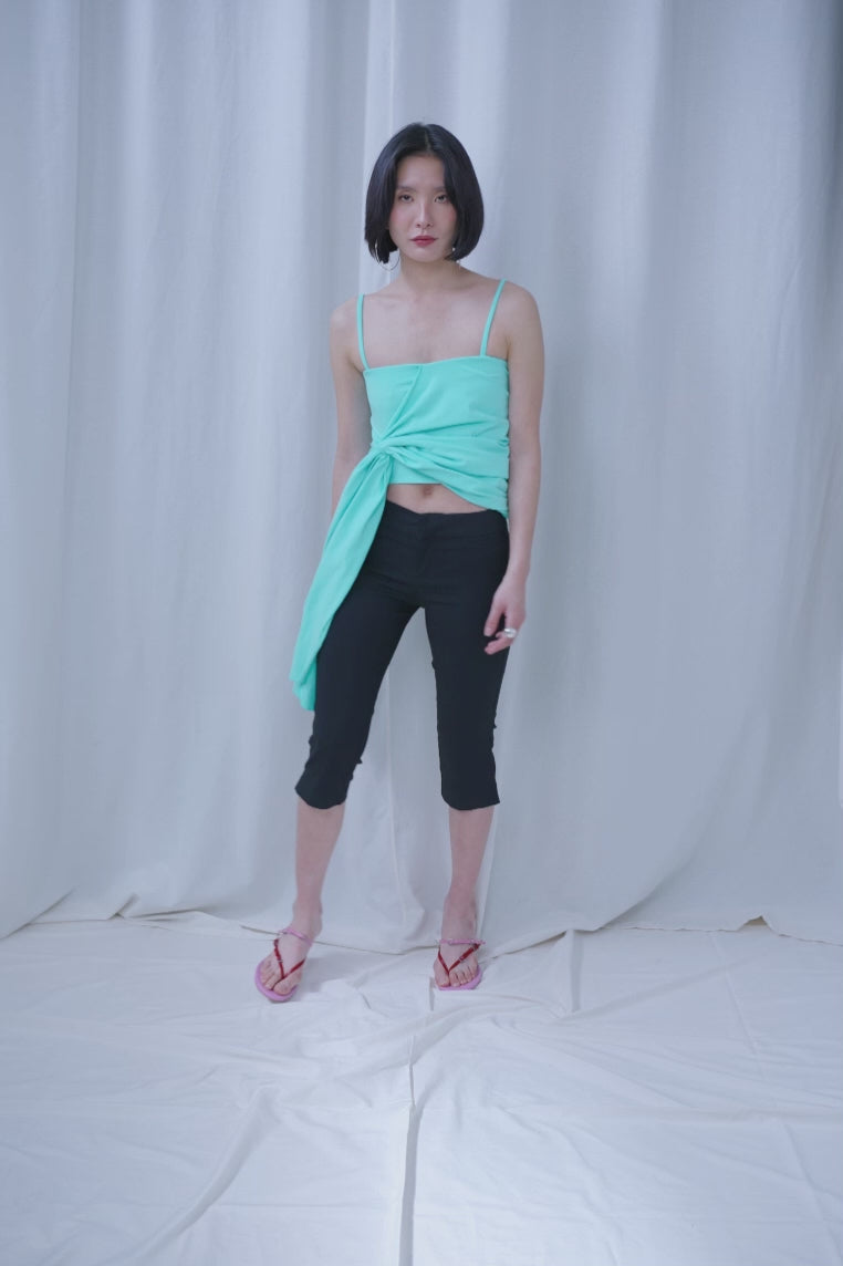 Top asimétrico de tirantes con capa drapeada en punto camiseta turquesa